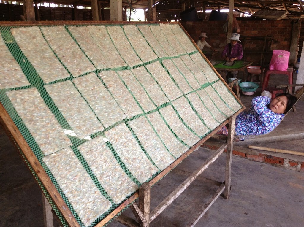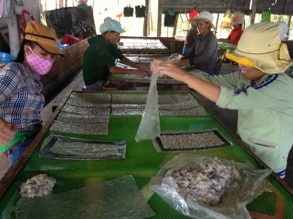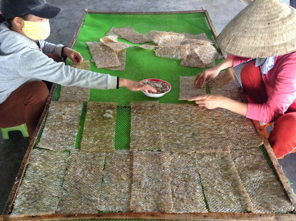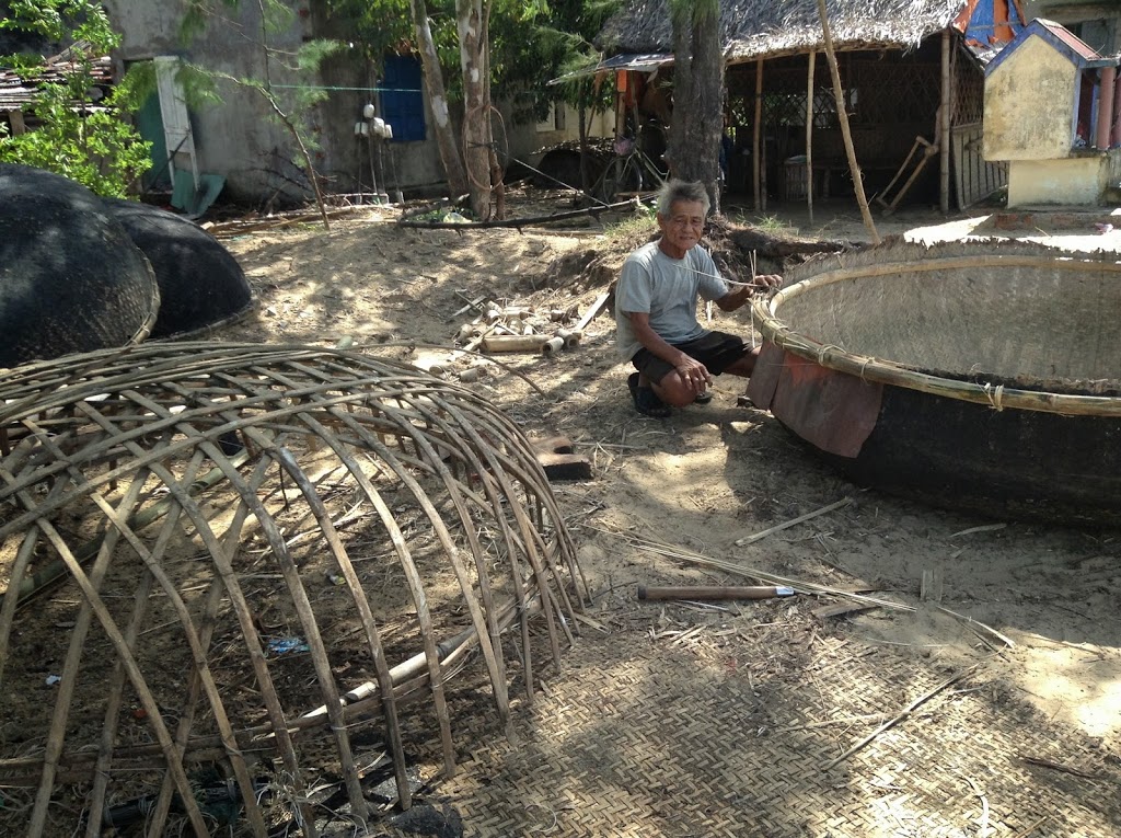 Our day trip from Hoi An leads us to the discovery of two distinct product lines: Dried fish “paper” on a grand scale and bamboo circular boats being made by one artisan.